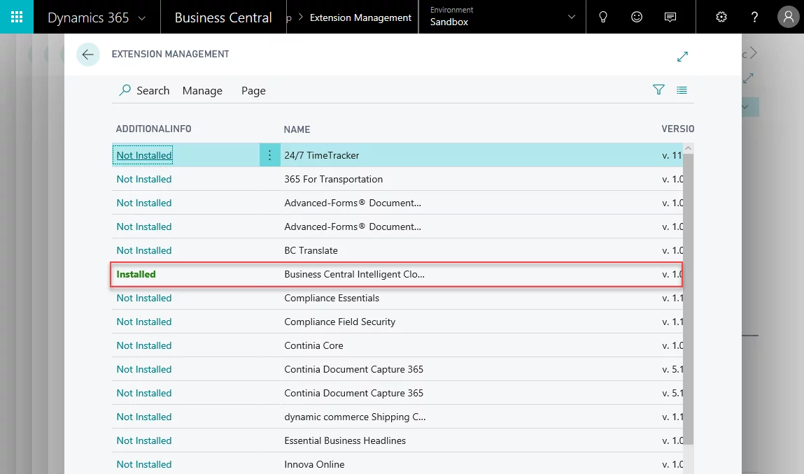 2. Install the standard Business Central Intelligent Cloud extension.