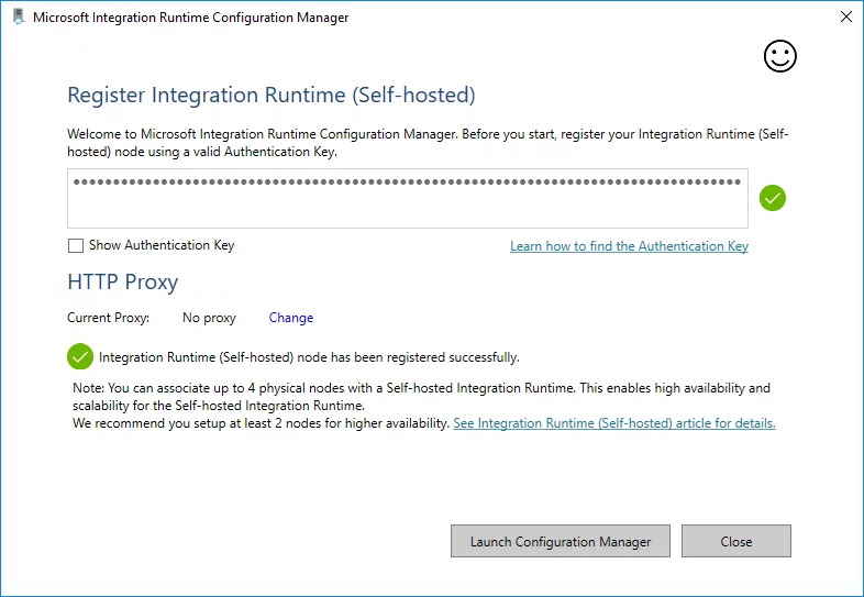 Select Launch Configuration Manager in case the Integration Runtime node was registered successfully.