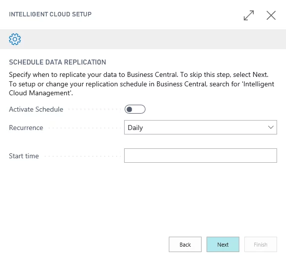 20. The final page in the wizard allows you to enable the replication process and create a schedule when data replication should occur. These settings are also available within your Business Central tenant on the Intelligent Cloud Management page. You have the option to schedule replication daily or weekly. Microsoft recommend that you schedule your data replication for off-peak business hours.