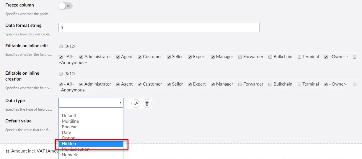 You can hide fields from grid or detail pages using the Hidden data type. This does not depend on the member permissions. A hidden field is not turned off and may still function in the background.