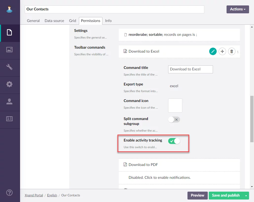 The tracking functionality was expanded. Now you can also enable member activity tracking for the Export (allows members to export data in the Excel, PDF, or CSV format) and Download files (allows portal members to download document attachments) page actions. If enabled, an act of using such an action will be tracked and shown in the member activity log.