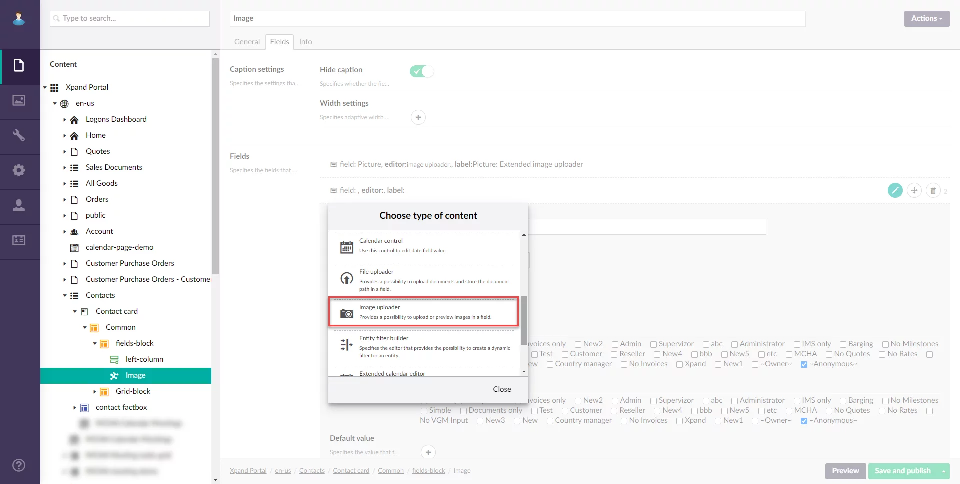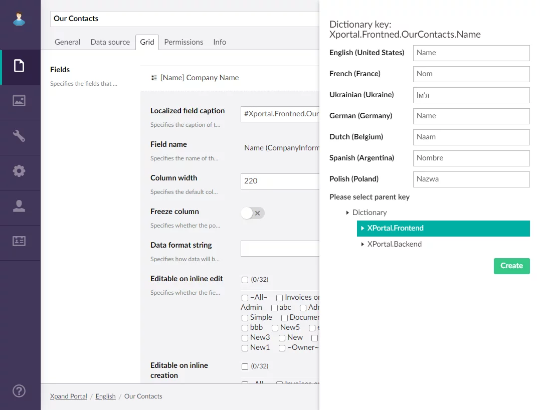 Previously, to configure captions for multiple localizations, you had to create separate nodes with the same pages per localization. This process has been improved. Now you can configure localized captions for pages, fields, and other page elements within a single localization node. To do this, you need to specify caption, you specify its dictionary code instead, starting with #XPortal.Frontend. This enables additional controls that allow you to either create a new dictionary item with all localization captions that you need for this page element or edit an existing one.