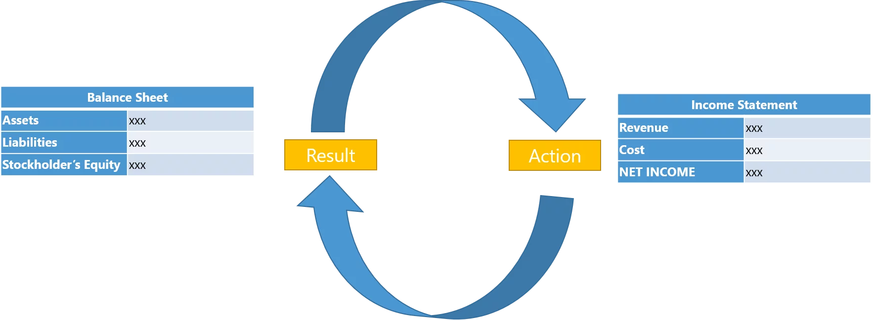 The balance sheet logic works a little bit differently: Assets = Liabilities +Stockholder’s Equity, where assets represent everything the company owns (such as cash, inventory, property) and liabilities and stockholder’s equity represent the source of the company’s resources.