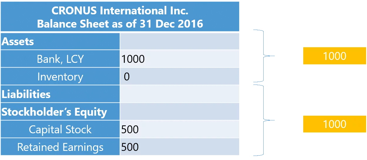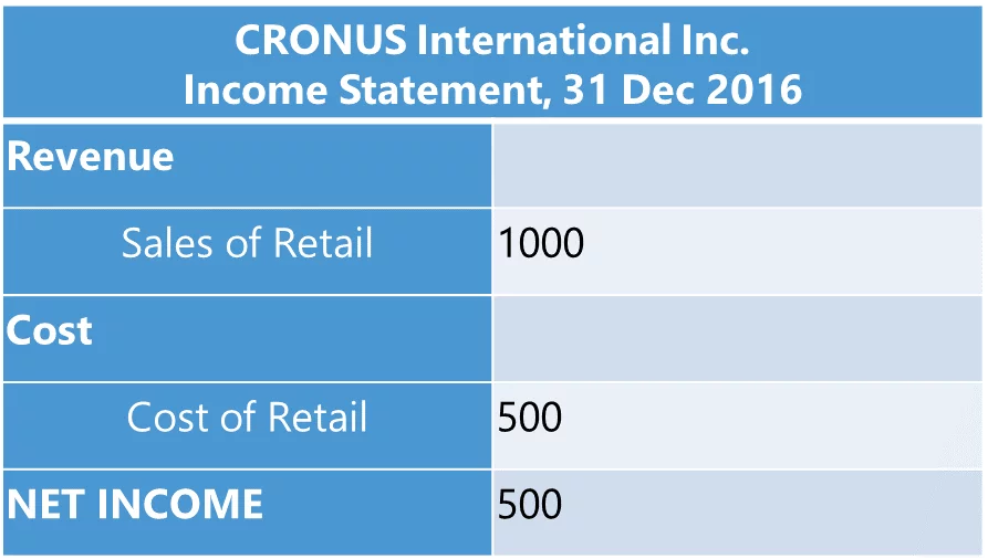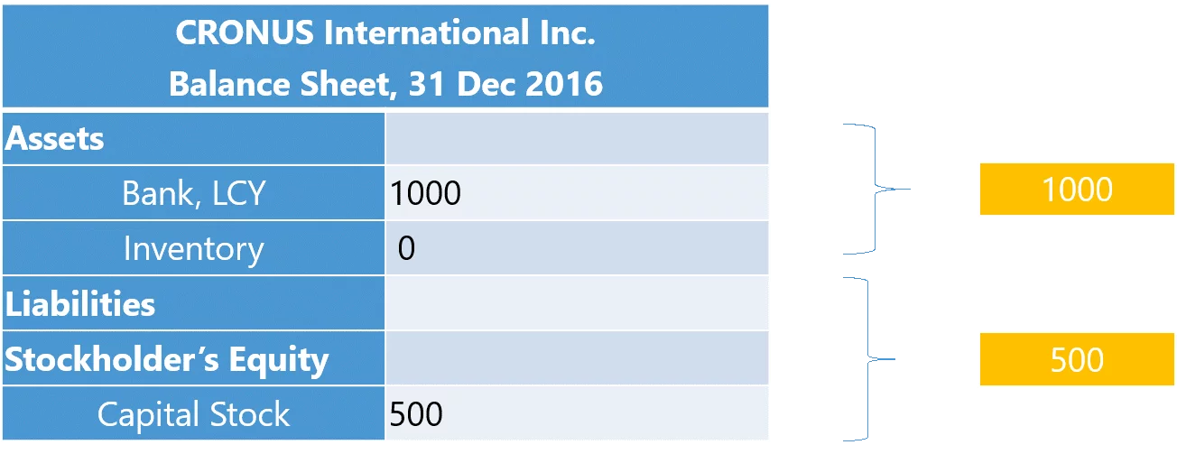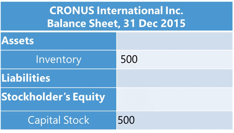 Suppose CRONUS International Inc. has been founded in year 2015. The stockholder invested $500 into the company’s capital, which has been recklessly spent on a purchase of one bicycle.
