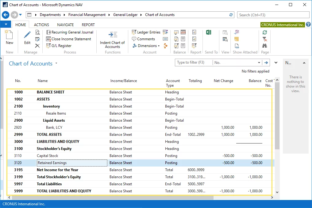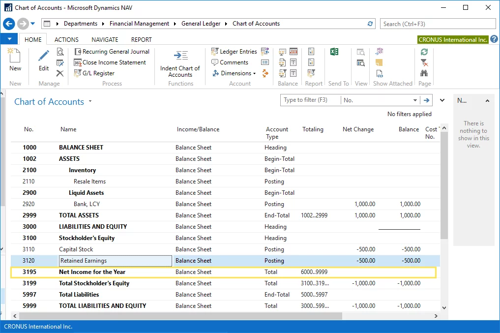 You may feel like asking how come that in Microsoft Dynamics NAV the balance sheet is always balance, even before the accountant performs income statement closure. If we look at the section Stockholder’s Equity in the chart of accounts, we will find another account Net Income of the Year.