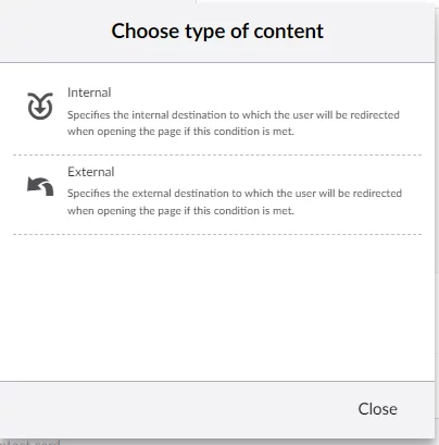 Redirect to External URL - Specifies the URL of an external page to which the user will be redirected when opening the page if this condition is met. Specifies the URL of an external page to which the user will be redirected when opening the page if this condition is met.