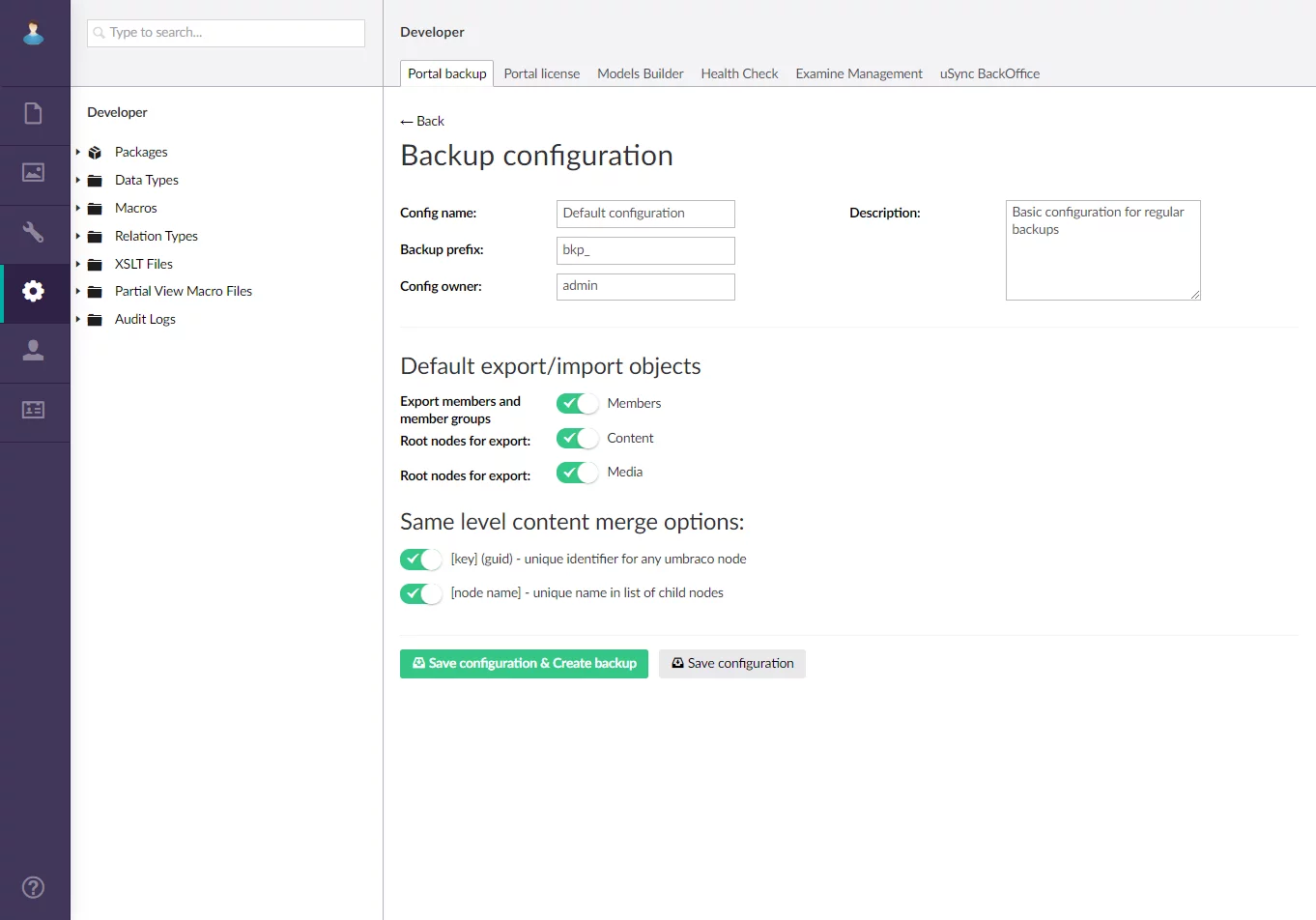 Prior to making a configuration backup or restoring a configuration backup, you set up import or export settings where you choose which configuration areas should be exported or imported, and how configuration will be merged during import.